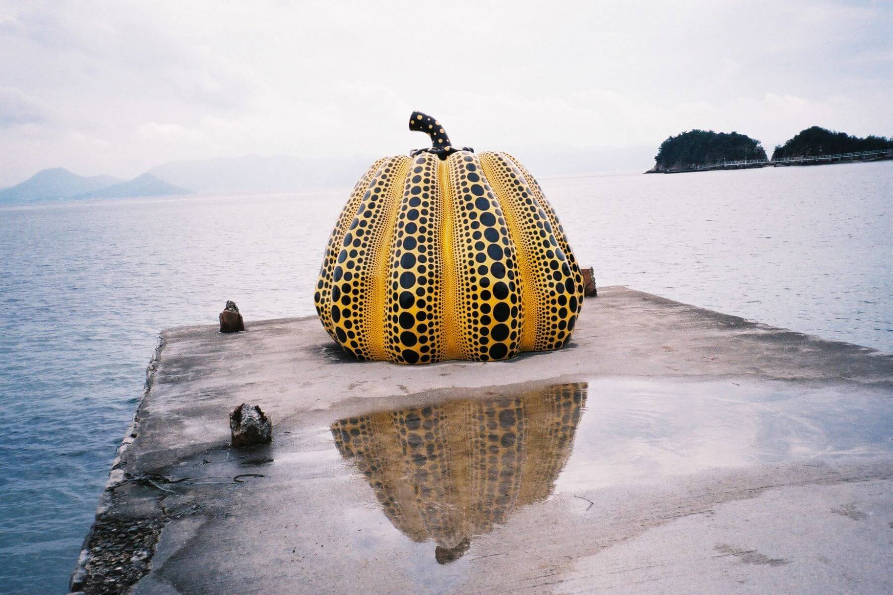 直島海邊,藝術家草間彌生的巨型藝術創作「黃南瓜」。(攝影/李豪)