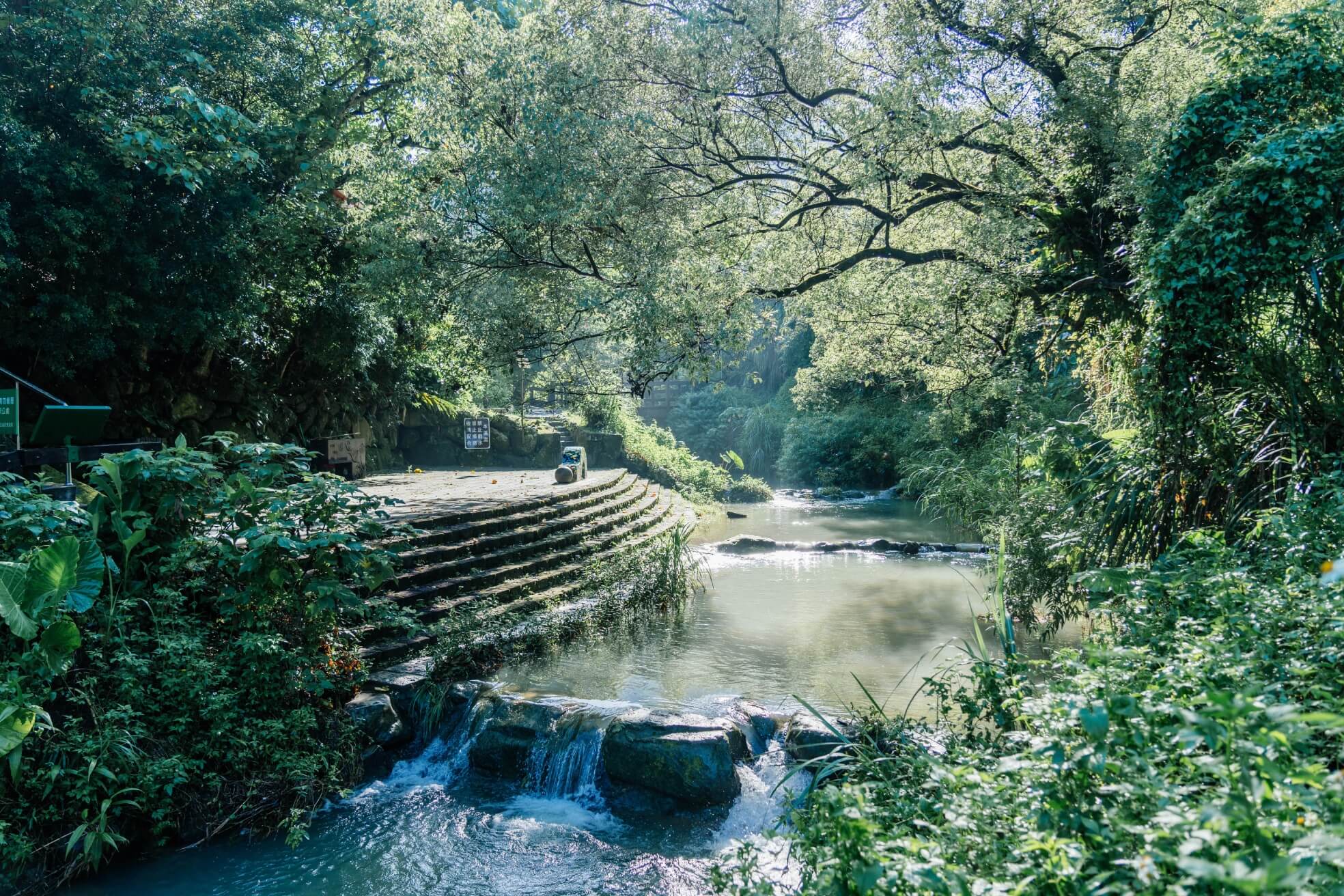 這段漫步時光,可選擇在涼亭乘涼,或走下階梯到親水平台觸碰冰涼。沿途陽光灑落,穿過構樹、白匏子、血桐的枝葉縫隙,苔蘚雜草化為地毯,在河床高低差之間折射光影,捕捉穿梭石縫的魚群。