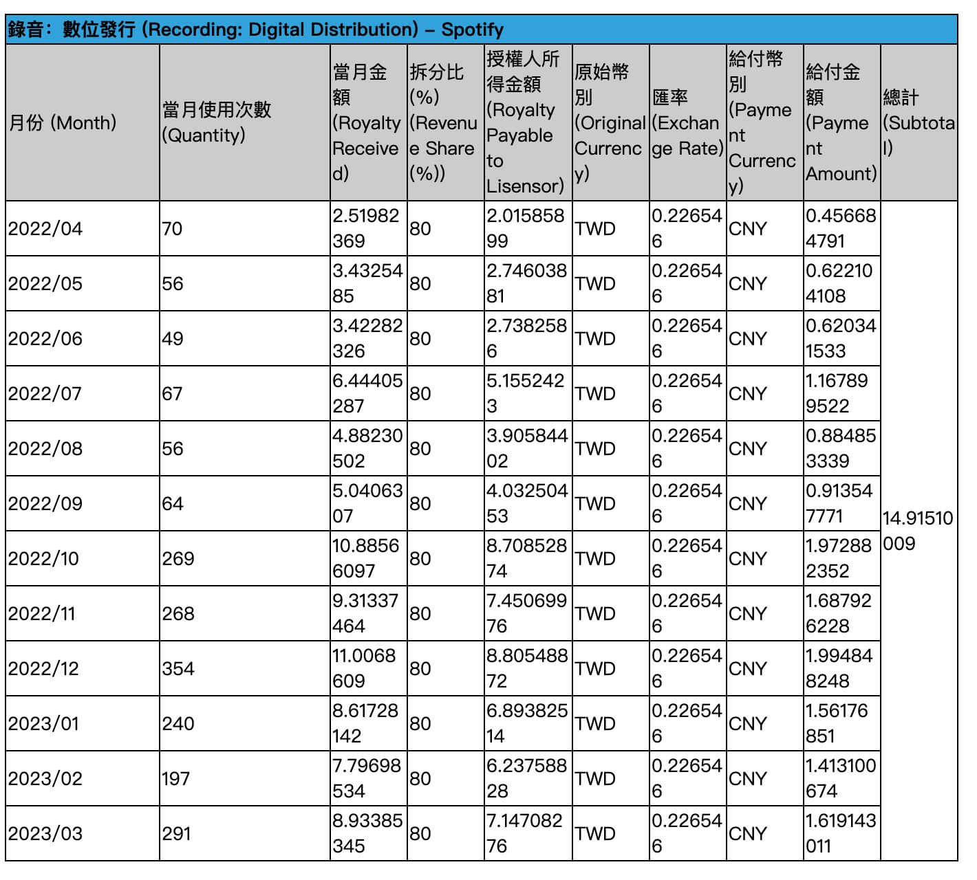 筆者的樂團「星號69」 2022-2023年在 Spotify 的版稅收入明細