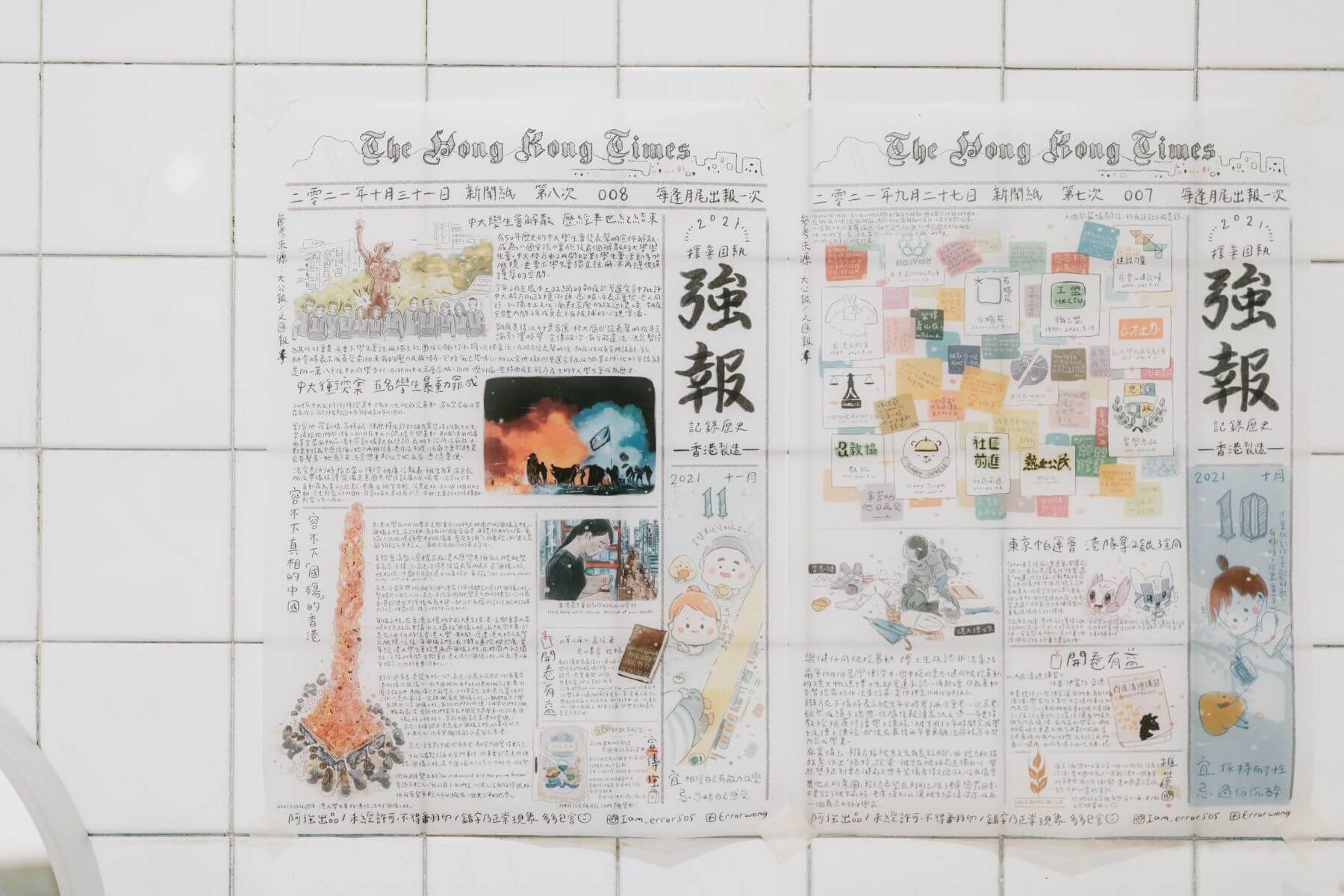 《強報》|香港插畫家阿強自2021年3月開始,每月底獨立出版手繪報紙《強報》,標語為「記錄歷史,香港製造」,以色調柔和、童趣的畫風記錄香港本地大小事,並推薦好書。阿燊說:「他用可愛的畫風記錄很沉重的本地內容,但讓很多人知道,還有人在關心香港發生的事情,讓看到的人從中獲得力量。」