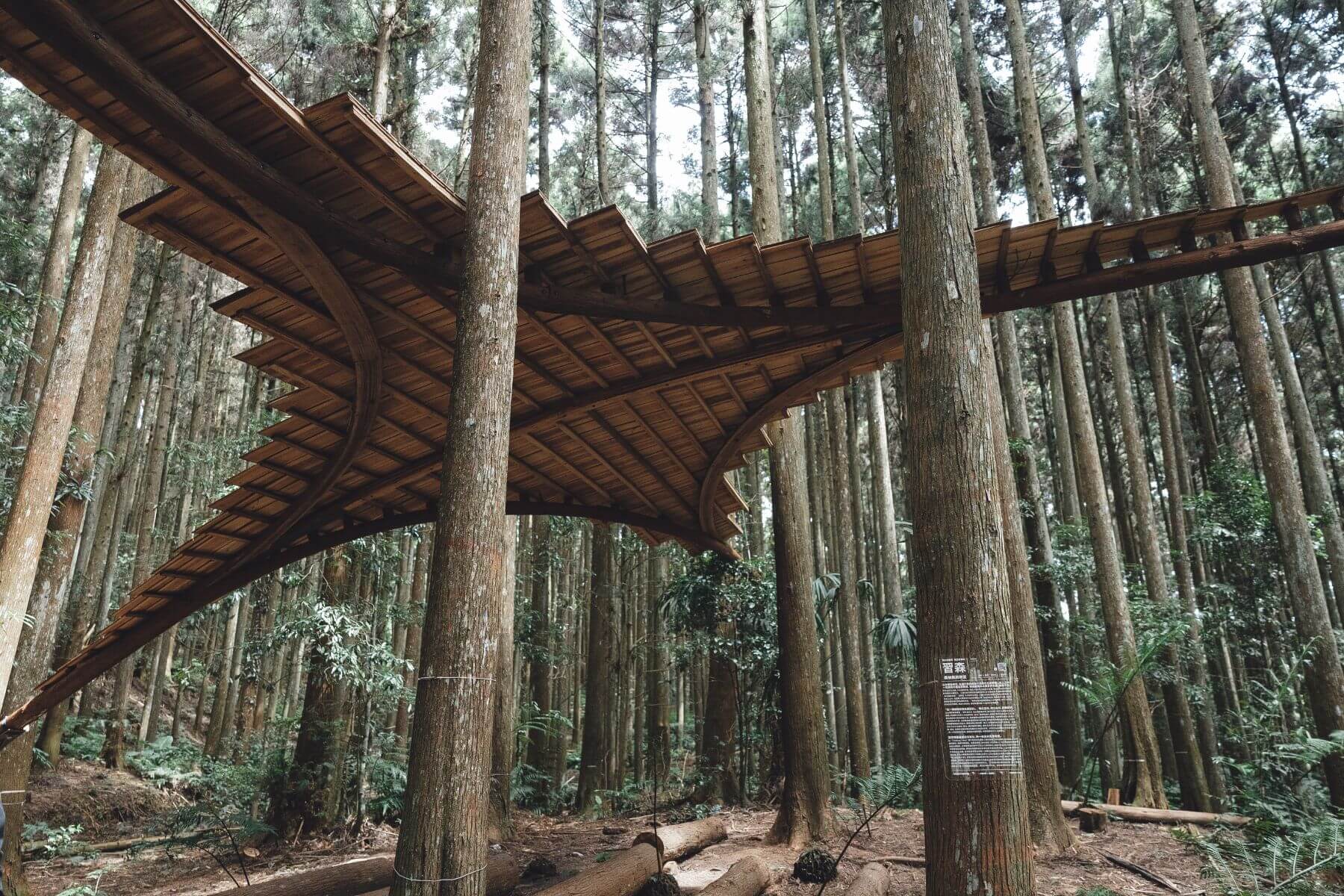 走入森林實作,設計就不再只是沒有重量的線條,而是學生們必須想辦法一一落實的挑戰,這樣的設計才會有感動人心的力量。森林木十人小組為東眼山創作《脊森》、《浮森》等一系列六件作品,各自安靜地「生長」在森林之中,向到訪的每一位登山客展示充滿詩意與美的國產材應用。