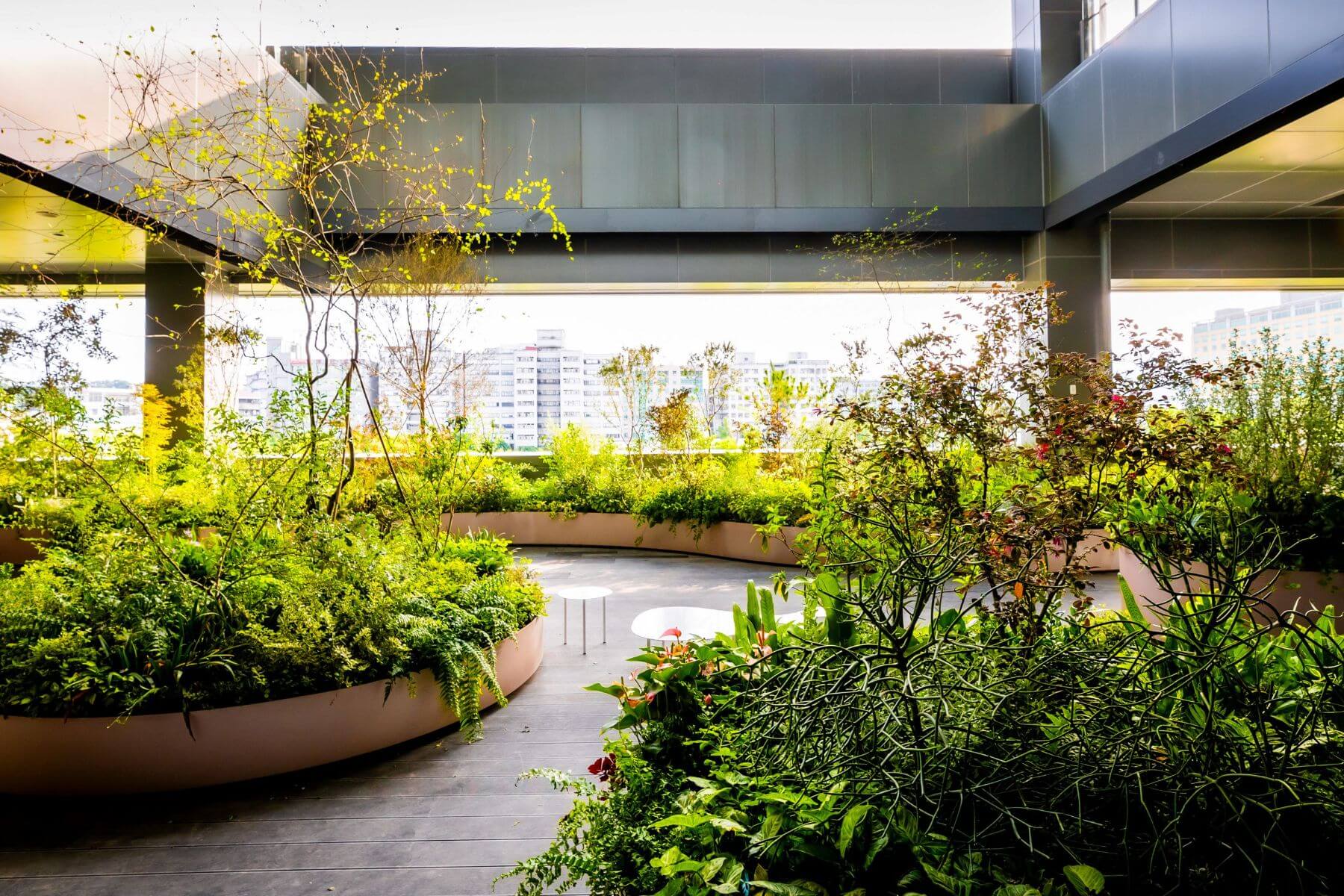 誠品生活新店擁有可眺望7,000坪綠湖生態公園景觀的「野花園」露台,呼應台灣原生海拔植物綠意。