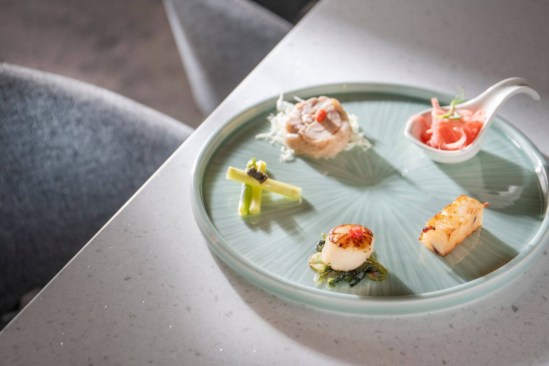 還有台南甲子園茶行的高山茶與紅烏龍,是來自超過一甲子歲月的製茶工藝。飯店餐廳不像一般飯店的buffet形式,而是供應「慢食」套餐一道一道品味,菜單設計由香港主廚團隊規劃新派粵式料理與蔬食,脈絡可追溯到鄭成功來台帶來福建廣東的飲食文化。