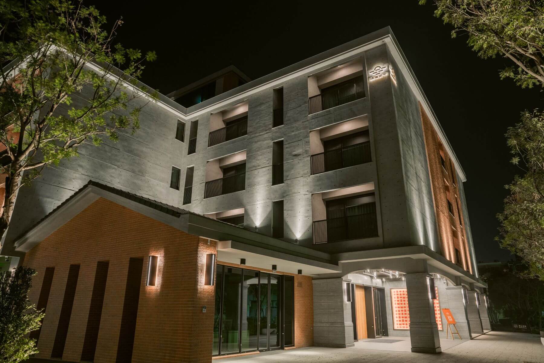 亮點1. 磚塊暖赭紅+清水模冷靜灰+幽默逗趣劍獅牆