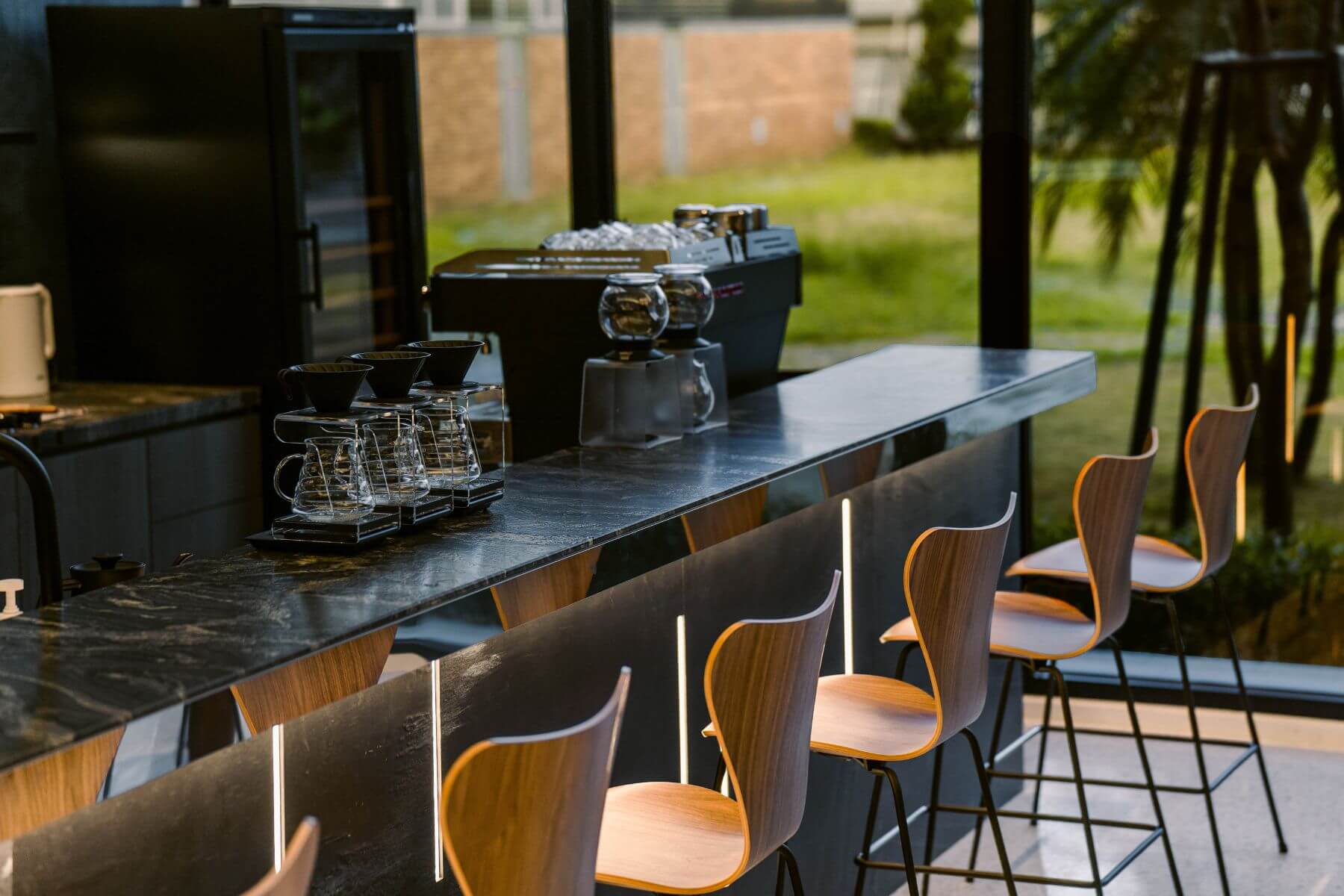 一樓咖啡廳的營業時間從上午11點至深夜11點,在下午4點check-in前,旅客可在此享用免費的迎賓下午茶點,搭配世界沖煮大賽冠軍王策VWI by CHADWANG品牌精選咖啡,還有台南老字號甲子園茶行冠軍製茶師蘇冠杰的台灣茶。晚間9點至深夜11點,咖啡廳則會搖身一變成酒吧,這裡擁有調酒師為安平獨家設計的酒精性調飲,入住旅客可免費品飲三杯。