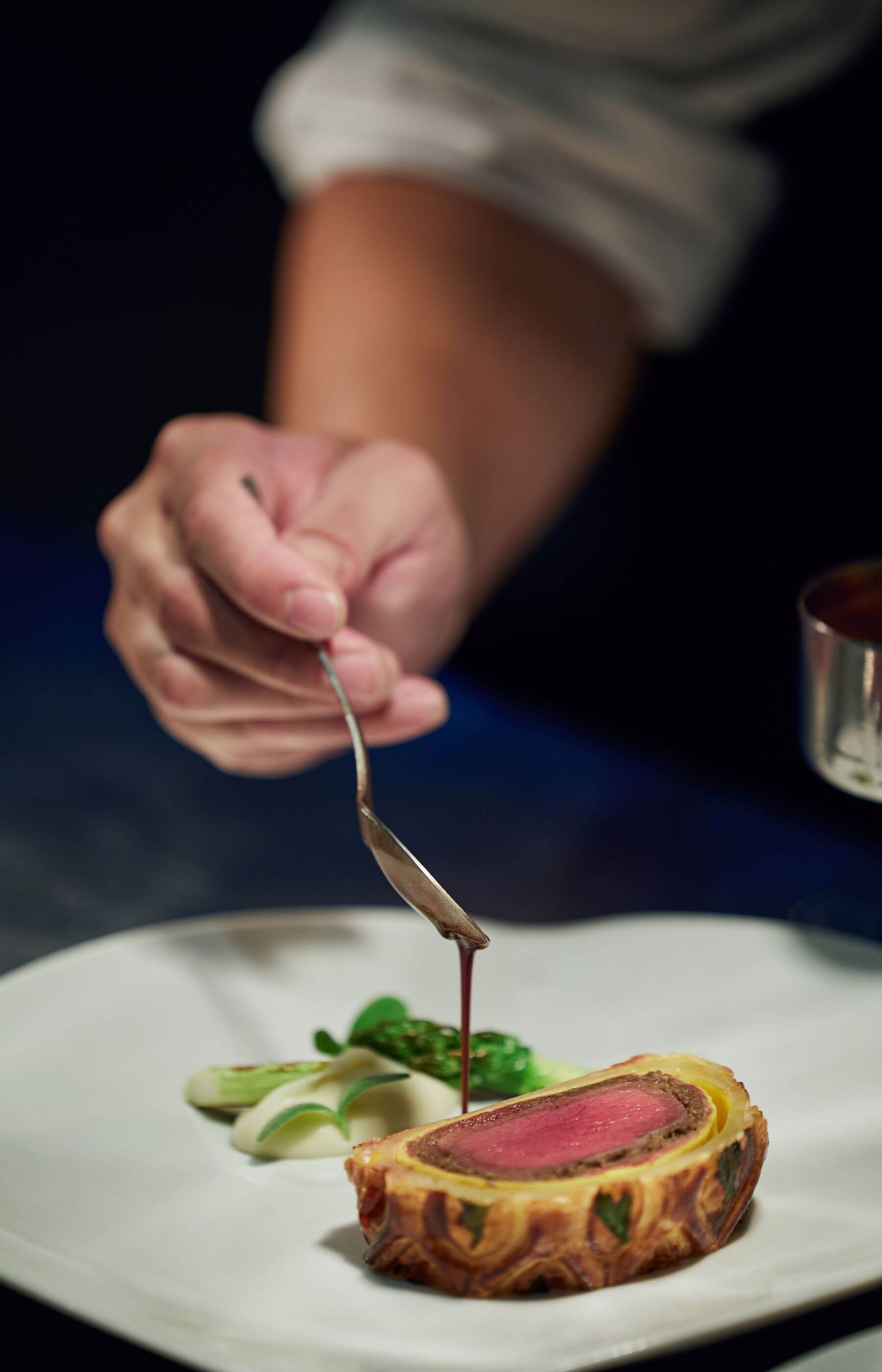 副主廚David的火力支援也很強大,喜愛玩味的他近來迷上澳洲12歲草飼和牛凝斂的肉香,取菲力製成考驗爐溫和包捲功力的「威靈頓牛排」,牛排切面多汁粉嫩,由內而外依序是牛肉、炒蘑菇泥、伊比利火腿、法式蛋皮與自製千層酥皮,牛肉與豐富配料一起享用,嚼來散發淡雅青草香,佐牛骨、牛尾、可可粉熬製的法式半釉汁品嚐更添深厚韻味。