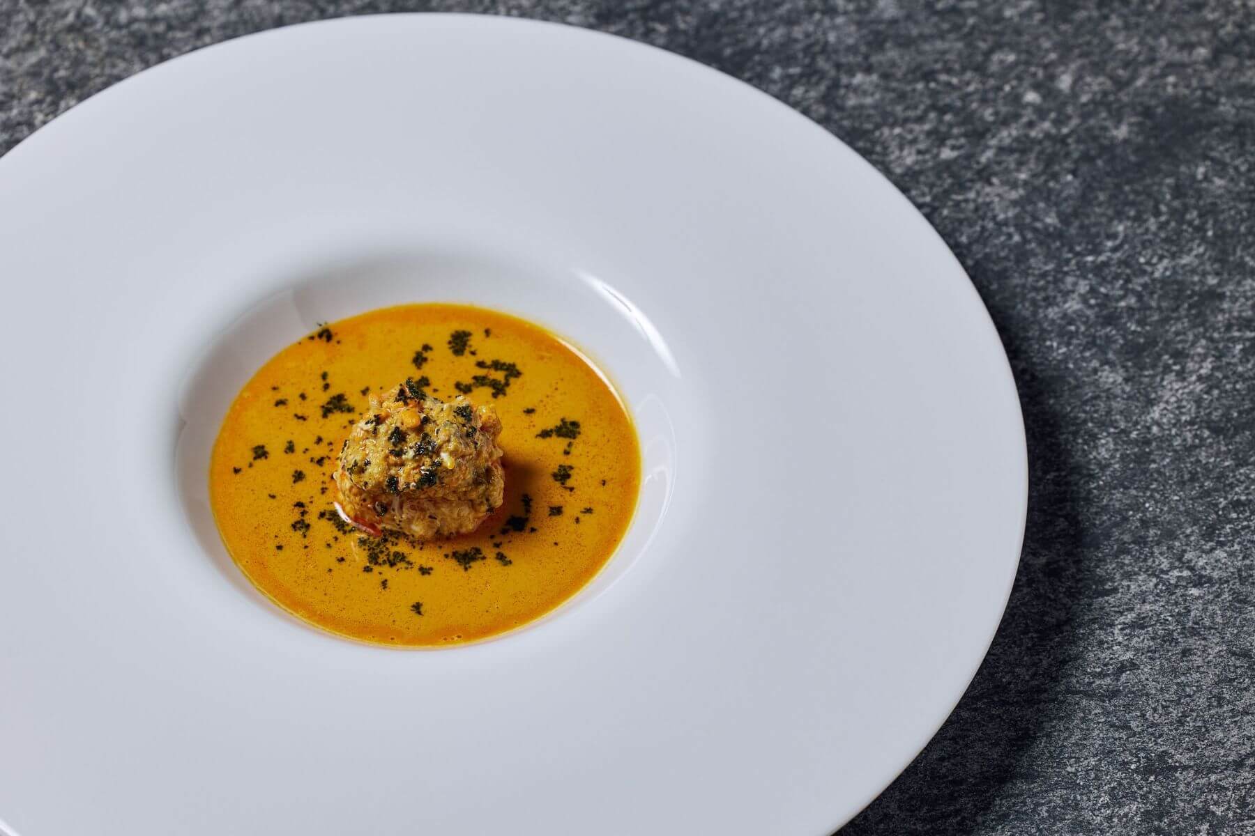 「大閘蟹海鮮濃湯」底蘊深厚的湯底是以魚骨與甜味蔬菜熬製,加入大閘蟹殼熬煮後再打碎過濾,與拆下的蟹肉、蟹黃一起享用,極致濃郁、鮮香奢華。壓軸的「大閘蟹雜炊」不只嚐得到大閘蟹肉、蟹黃精華,以北海道七星米和昆布、蟹味高湯熬成的稠滑粥湯也是一絕,鮮美到喝一口便教人欲罷不能。