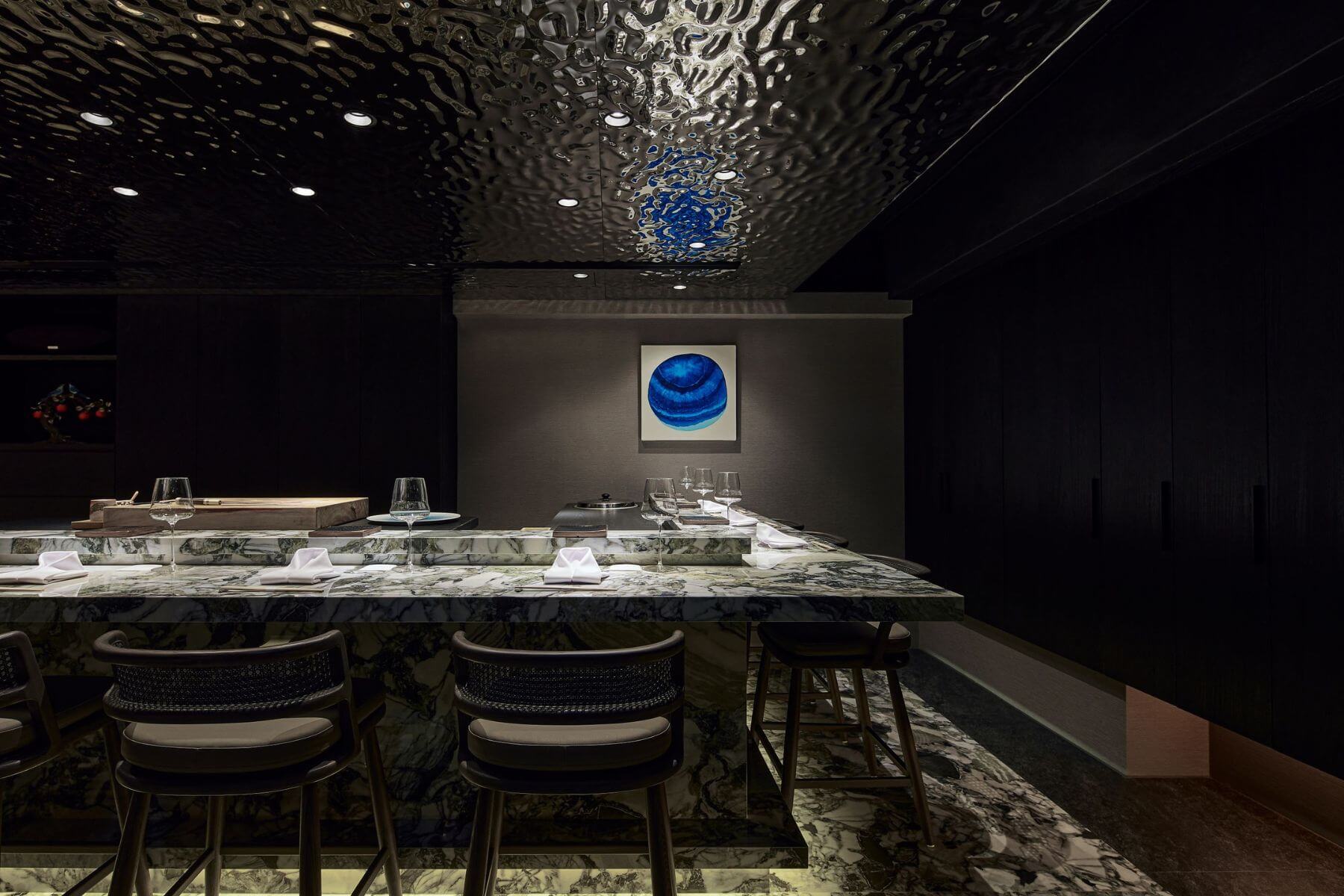 餐廳內,板前設計完全捨棄木料,光可鑑人的義大利冷翡翠大理石磚從地板一路向上延伸至吧台,乳白與碧綠的石紋交融、恢宏大器,鋪陳出展現廚藝的絕美舞台。板前頂上銀光閃閃,裝置藝術般耀眼的天花原來是手工打出鎚目紋的不鏽鋼片,藉此營造從水底看向水面時光線折射的粼粼幻象,仰望風景,同時身在風景之中。
