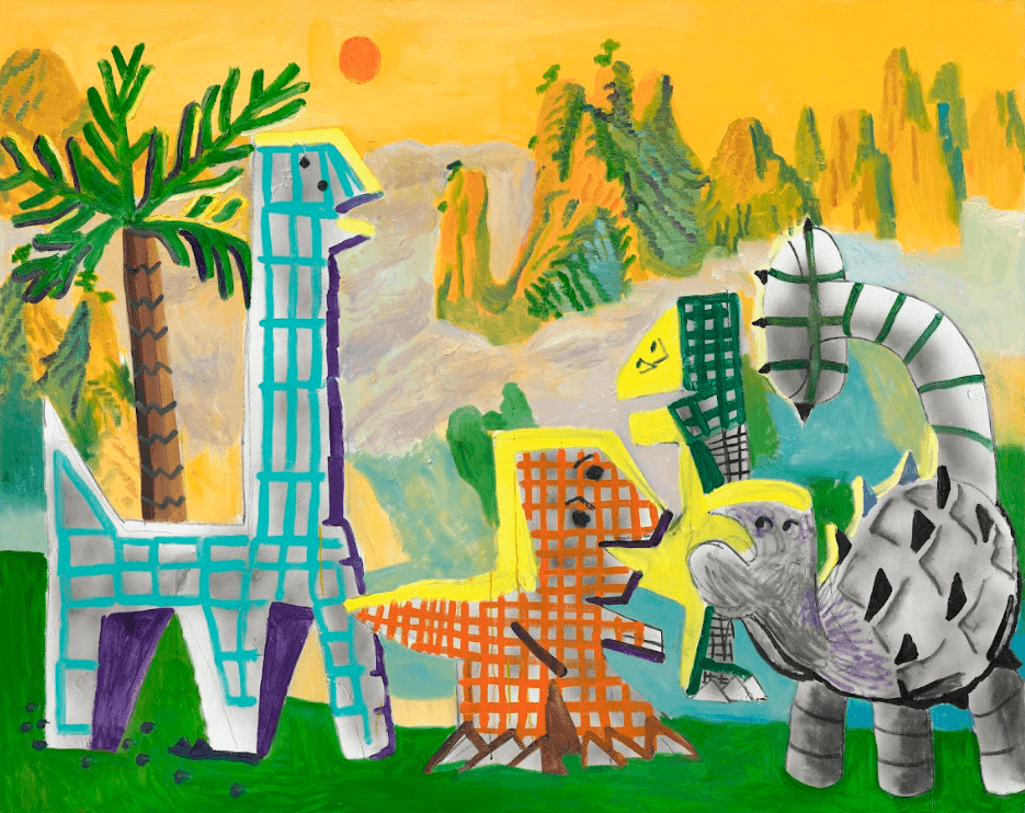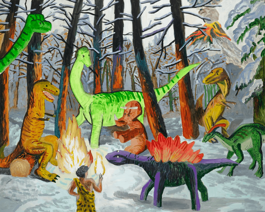 而「無主地裡的寶藏」靈感源自電影《人類之子》,設想當人類不再繁衍、文明走向終結時,金銀財寶失去了兌換意義,卻獲得了純粹的「觀看」價值,展現出一種荒涼的物質美感。最後的〈樂園中的恐龍〉系列, 將早已滅絕的霸主恐龍當作文明交替的象徵。在畫面中,本該是獵食者與獵物的霸王龍與三角龍竟坐在一起取暖,這種極致的偽和諧形成一種諷刺:原本你死我活的現實矛盾被刻意隱藏起來,營造出一種表面太平、實則荒謬的怪異氛圍。