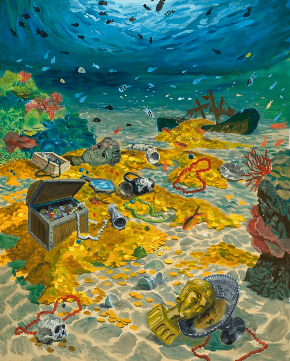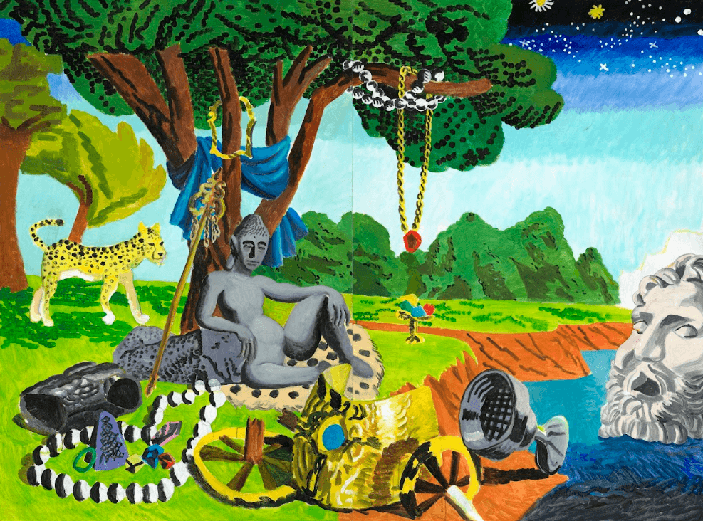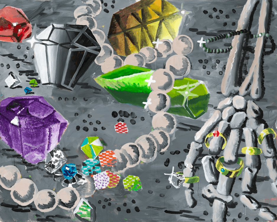 楊立的畫作中大量塞入了金銀財寶、發光的璀璨線條、佛像與樂高零件等符號。這些意象代表了他對「價值」的諷刺與重組:佛像與財寶在傳統中分屬神聖與世俗,但在他筆下,它們更像是被隨手丟棄在荒原裡的玩具,帶有一種荒誕的玩味。 樂高的出現則象徵了當代文明的「模組化」,一切都可以被拆解、拼湊再毀滅。而這些璀璨發光的符號,最終營造出一種狂歡式的繁榮假象,象徵著那些我們以為永恆的信仰,在盛世過後,或許都只是些華麗卻無用的殘片。