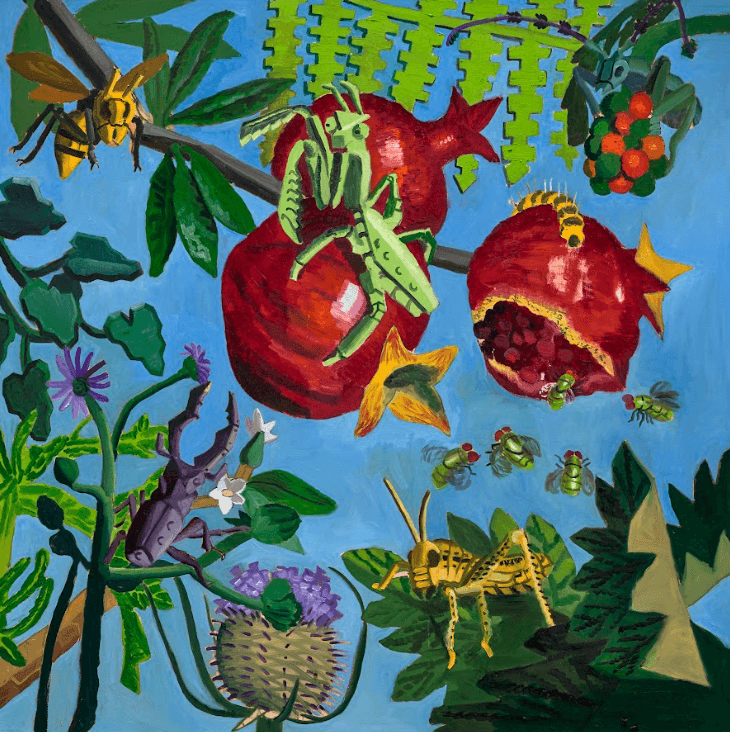 在展覽架構上,楊立透過四個子題交織出文明的多重面向。首先在「碩果與夏蟲」中,他探討的是「腐敗(Corruption)」的美學:最美好的事物往往在盛產巔峰即開始崩毀。他在華麗背景中安插猙獰的啃食感,揭示慾望與消亡的並存。像這樣對個體慾望與生命凋零的議題,在「地圖上的武器」系列中進一步擴張為對集體意識與地緣政治的探討。楊立將政治與軍事符號(如國旗、砲彈、火藥等)意象化,探討影響台灣最深的強權力量。對他而言,真正的武器或許並非槍砲,而是像「意識形態」這般隱形卻巨大的掌控力。