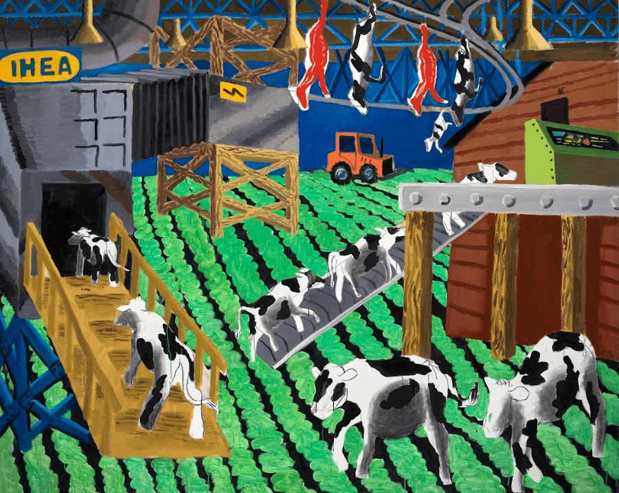 除了視覺上的遊戲感,楊立也愛在細節裡「玩」得更深。他喜歡在創作中埋入讓人會心一笑的畫面,甚至熱衷於文字遊戲,例如作品名的中英文刻意呈現截然不同的語意,或是大玩充滿台灣味的諧音梗。這種在語義邊緣試探的幽默,與其說是調皮,不如說是他對時代的一種真誠抗爭:當大眾忙著崇拜權力與財富時,他卻在畫布上玩得痛快。