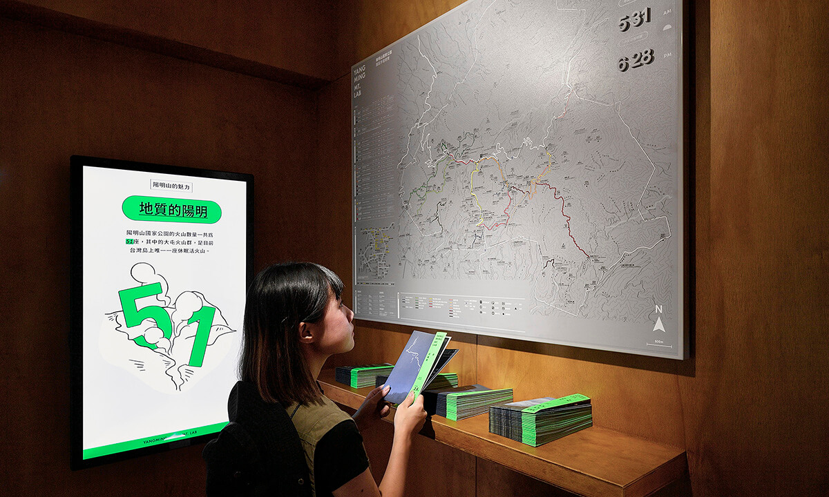 「欲研究大自然,用自己的雙腳實際走一趟才深切有感。」若想在此索取陽明山的相關資訊,你會先被邊條壓著螢光綠的DM吸引,內容分別是四條郊山「建議路徑」:難易度分為散步級、健行級與挑戰級,推薦各位郊山愛好者舉步踏上「夜的陽明」(2.6km,散步級)、「味的陽明」(8.5km,健行級)、「地質的陽明」(3.7km,健行級)與「冒險的陽明」(5.5km,挑戰級)。