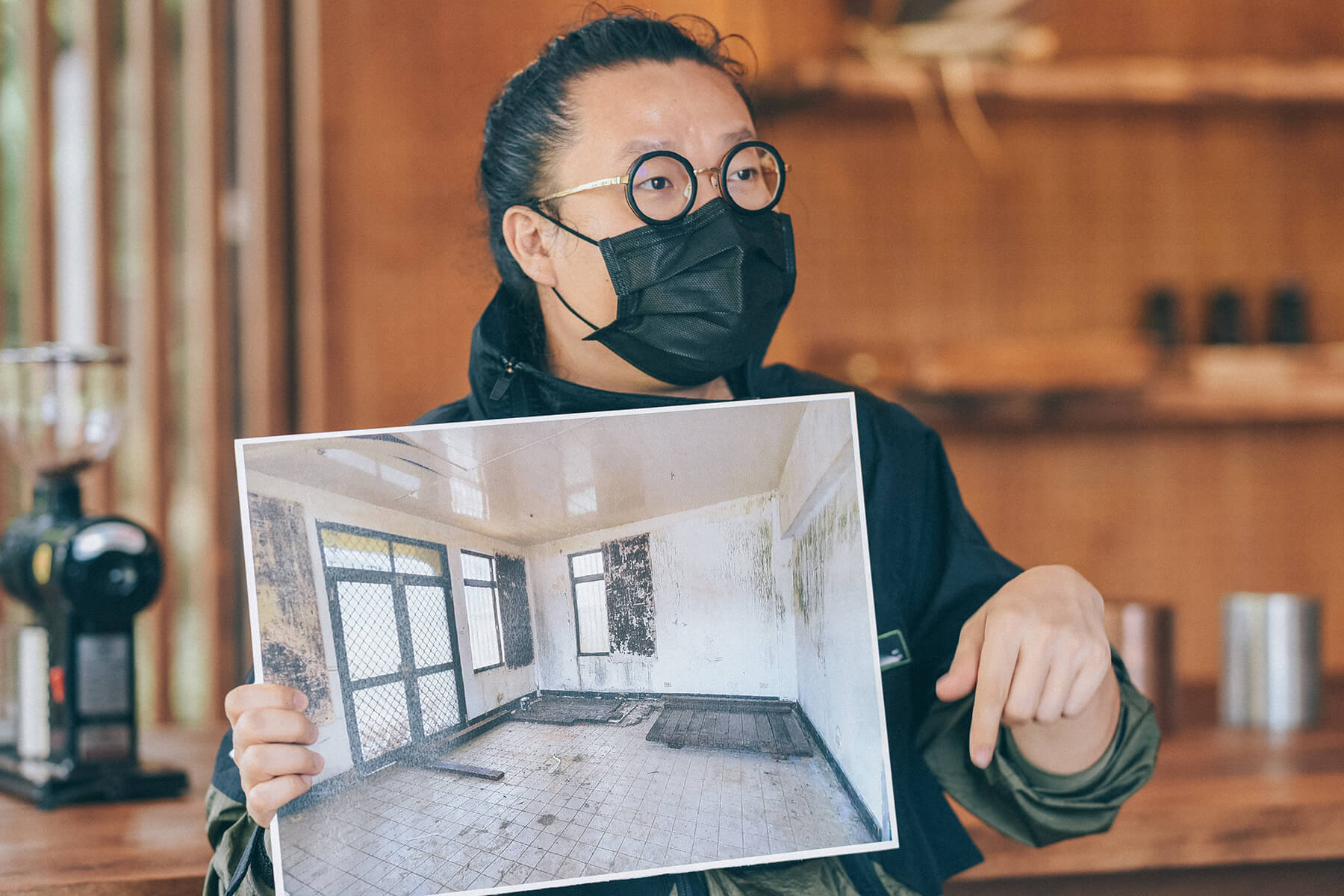 「陽明實驗山屋」原本是小觀音停車場的休息處「小觀音山房舍」,格子手中的照片即該空間荒廢時的樣貌。