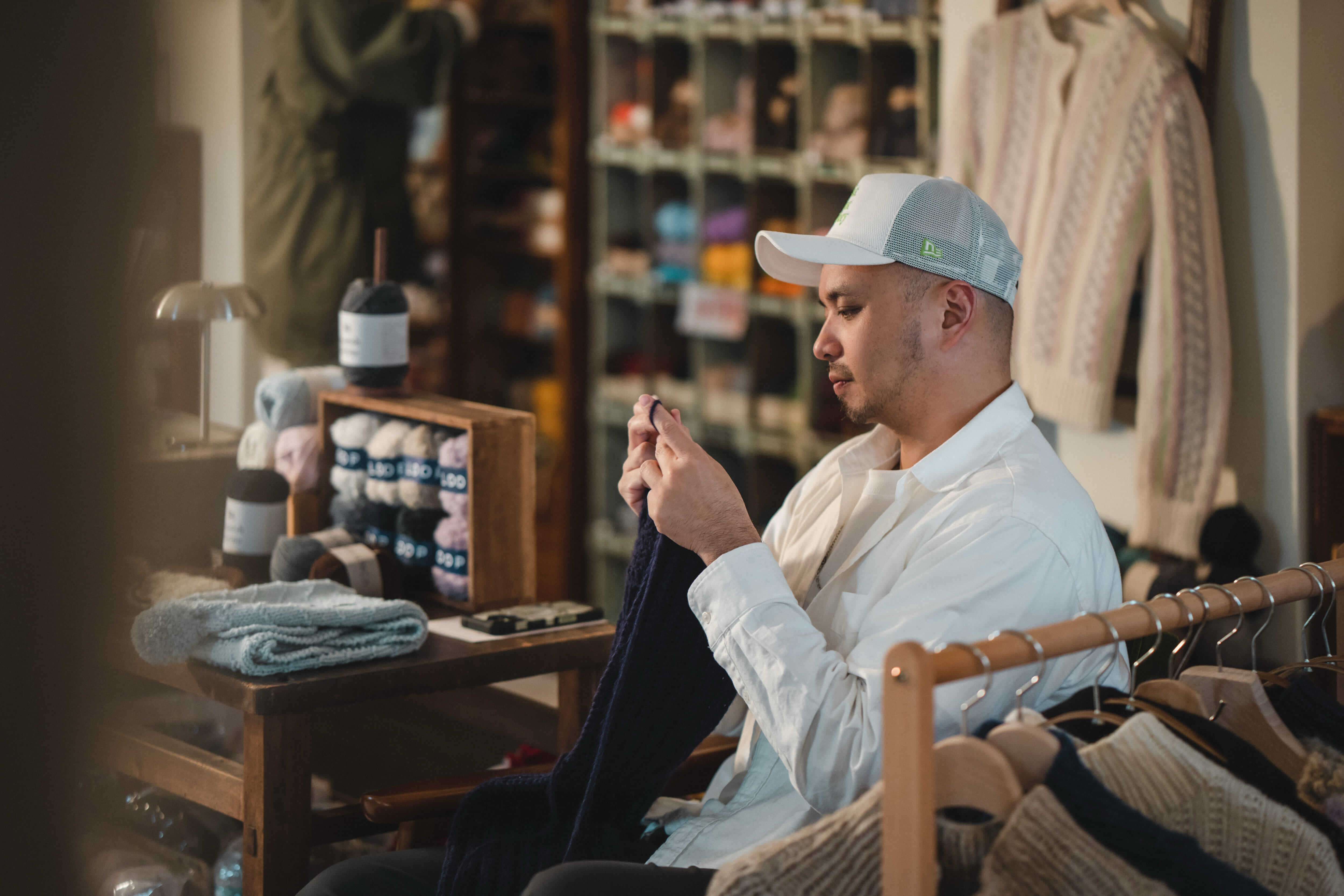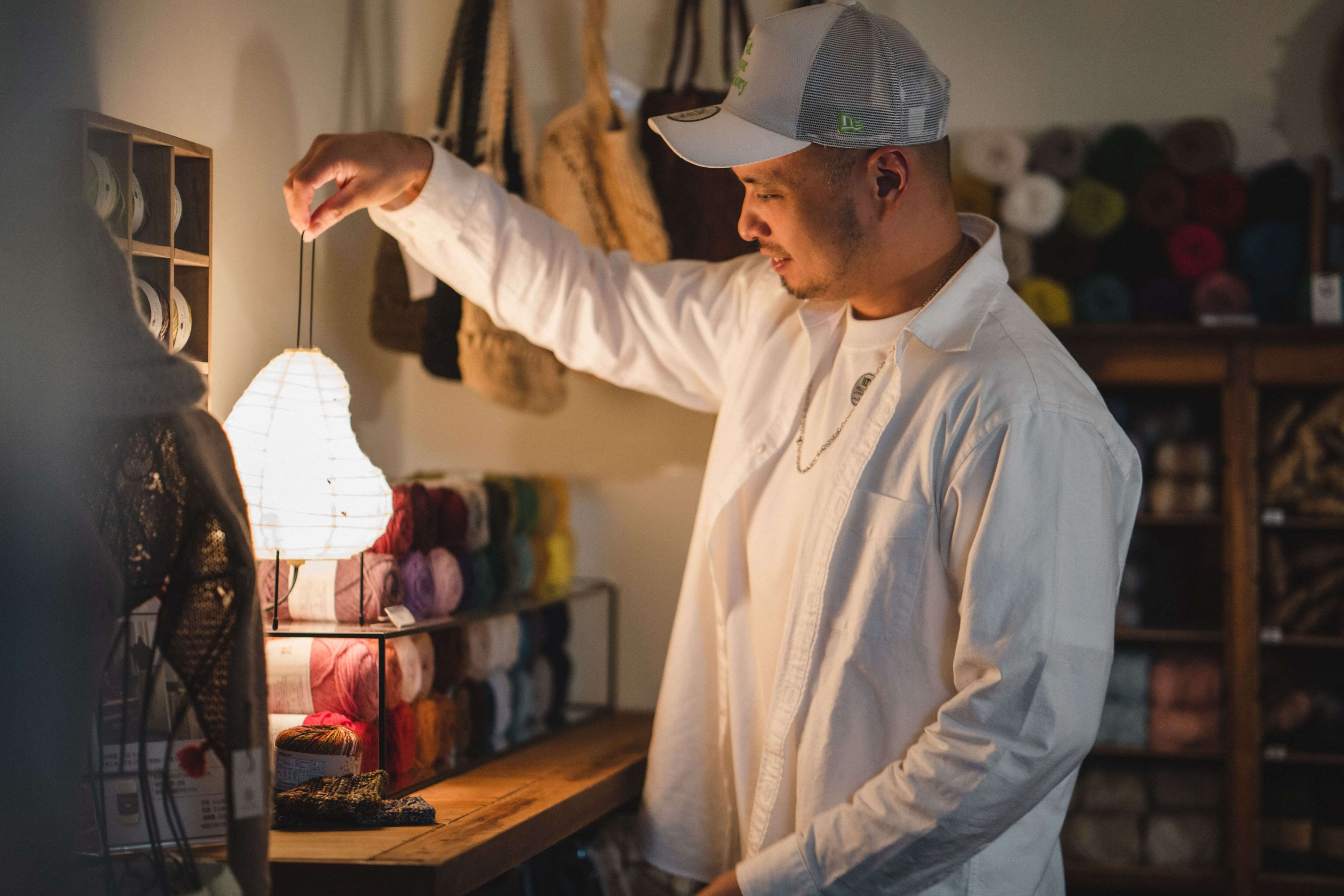 他坐在桌邊,舉手投足間有一種文學人的儒雅。空間裡總是流淌著輕柔療癒的旋律,而這份聽覺的穩定是空間的靈魂,一旦樂音斷了,他便會想方設法地趕快接回來。這份對「斷點」的在意,一如手裡的編織,線段之間必須緊密承接,才能織就一段安穩的時光。