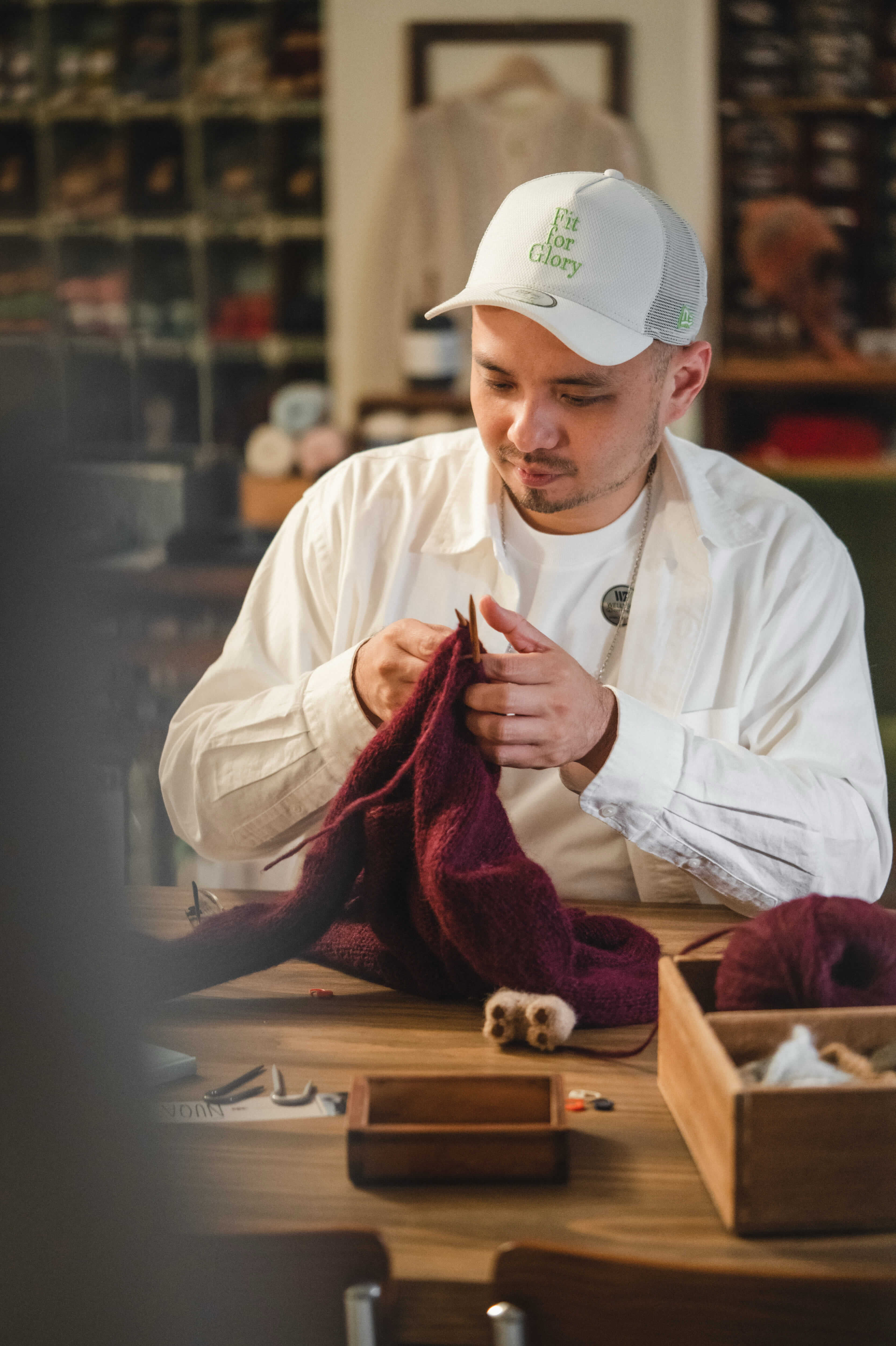 對待學員,他在意的從不是進度與成果,而是人是否在過程中變得焦慮或逼迫自己。「織錯了,拆掉就好,你依然可以很easy地面對一切。」這句話既是在說毛線,也是在說人生。當時間在鉤針間慢了下來,人會開始反思:以前這麼盲目地追求卓越,真的有必要嗎?他不希望看到任何人,為了做出「好作品」而再次陷入近乎瘋狂的狀態——那樣的執著,在他看來未必需要。