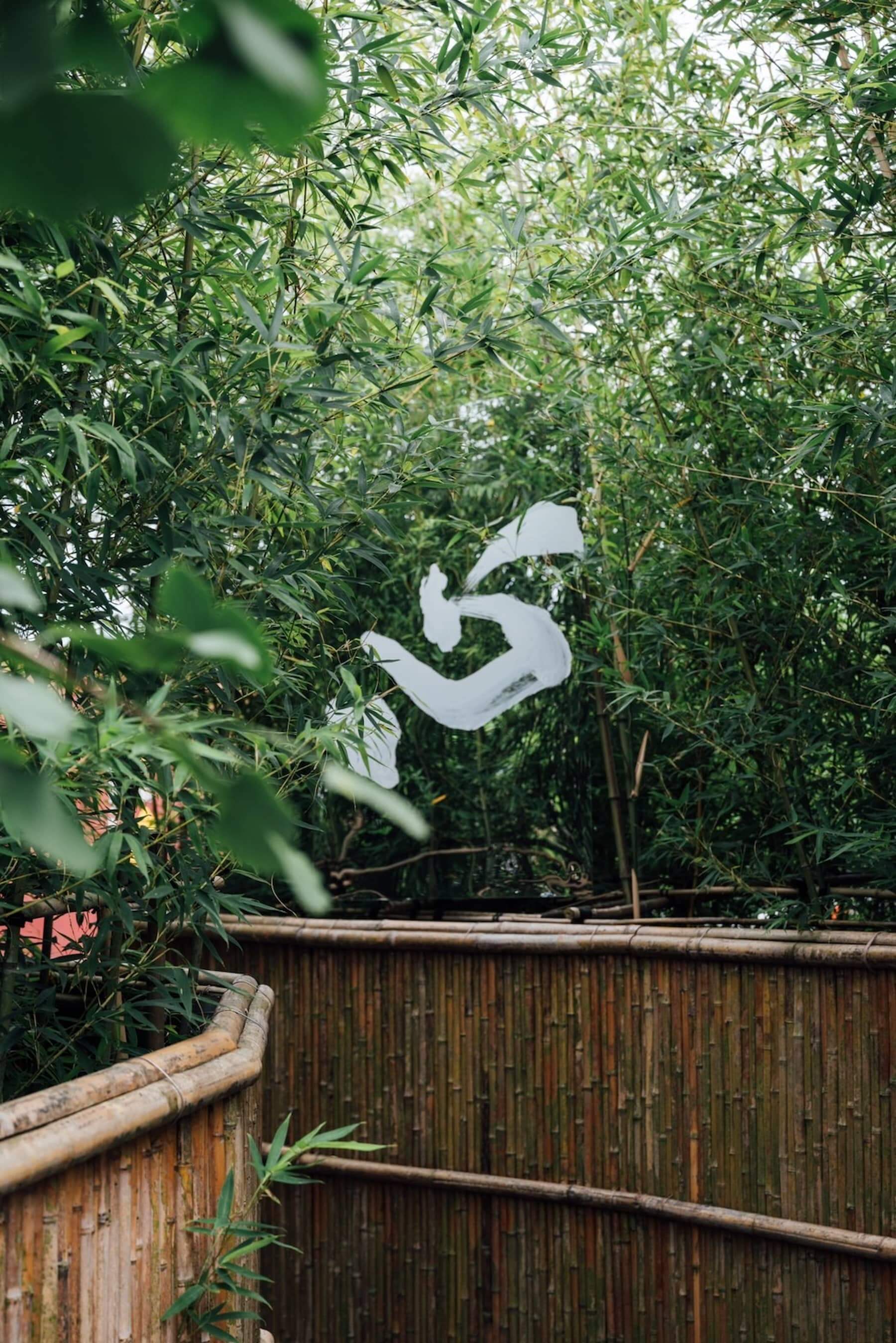 走進裏山的日式庭院,作品《醉了》如引首般,書寫於庭院中的酒甕上,做為展覽破題;沿著石子路緩慢行走,作品《心》書寫於鏡面,懸掛於竹林中間,映照綠意與心境;《翠》則呼應著山巒景緻,字裏有山,山裏有字。
