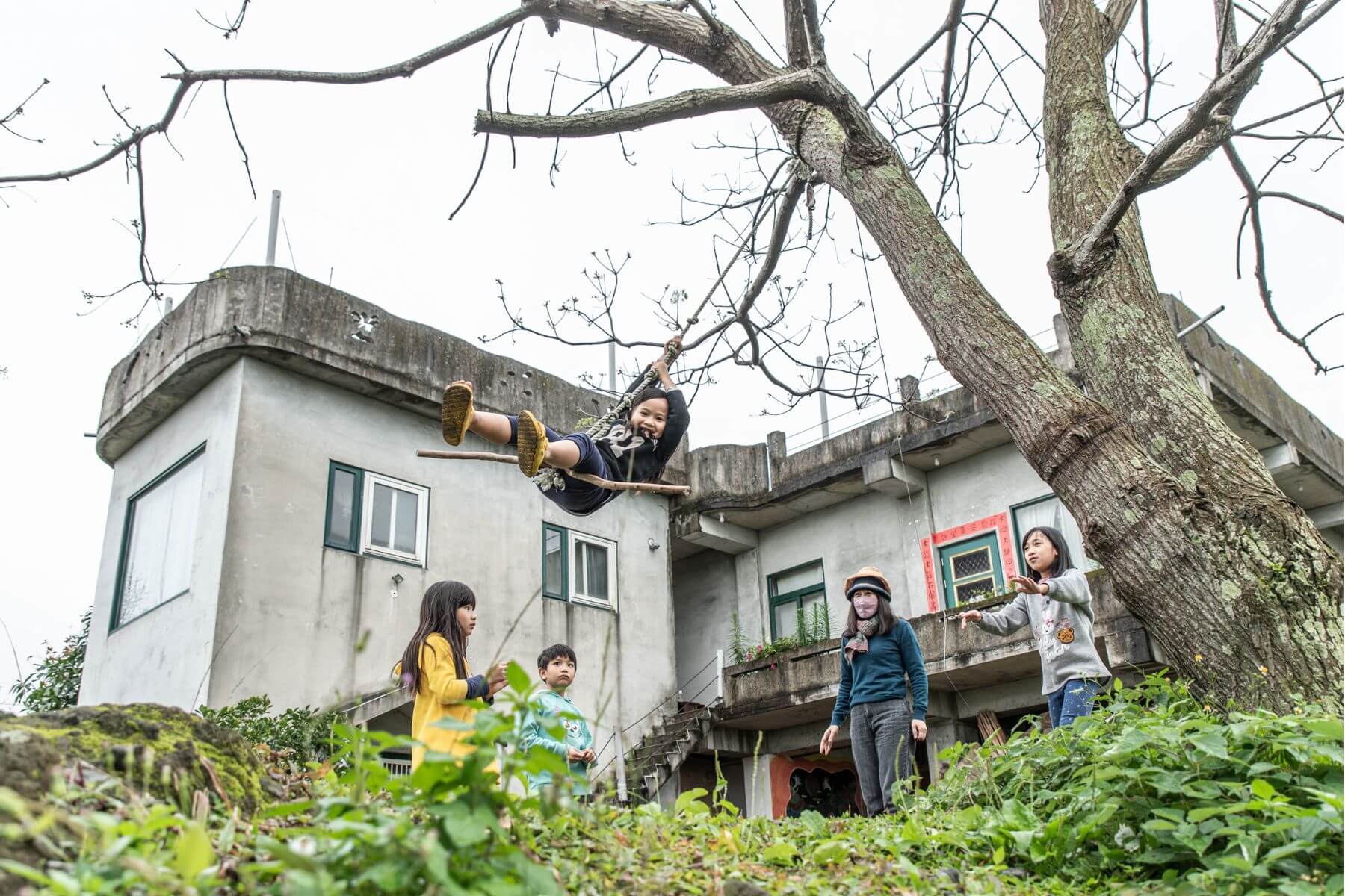 以莉・高露到 TAMORAK 母語共學園接女兒,孩子們在園區的鞦韆玩耍。