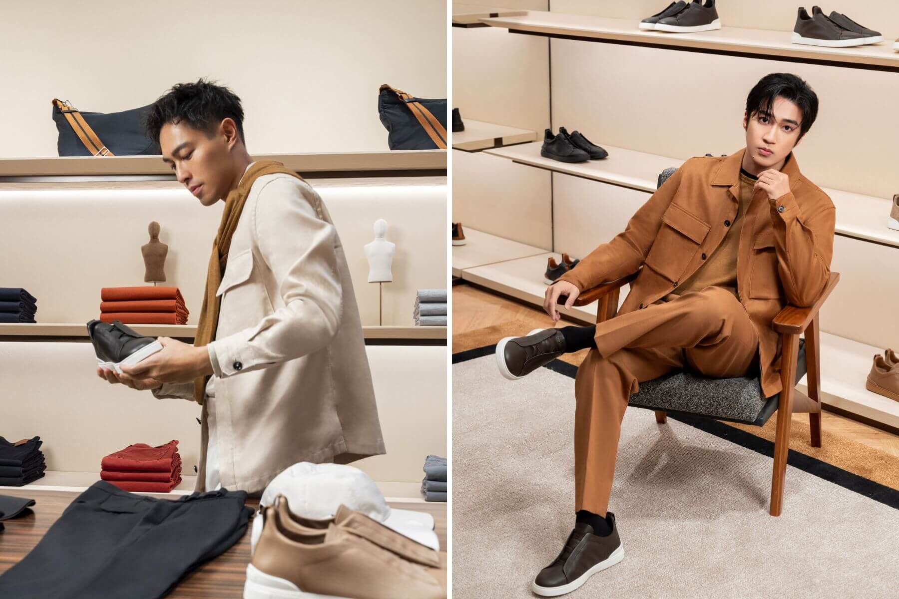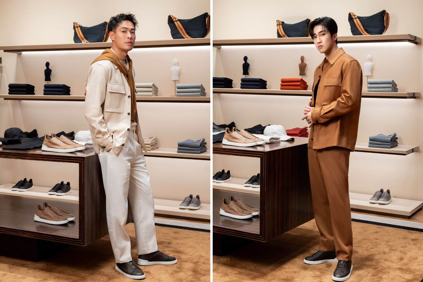 旗艦店開幕當天,品牌邀請演員楊祐寧與歌手婁峻碩參與盛會,兩人率先換上ZEGNA 2024夏季Oasi Lino系列,搭配該品牌新款標誌性奢華休閒鞋Triple Stitch SECONDSKIN,清爽的米白色與大地色系tone on tone造型,展現Alessandro Sartori自在從容的男士衣著方案——ALBA襯衫外套與同色系長褲、素雅的圓領針織衫,盡顯紳士俊逸風采。