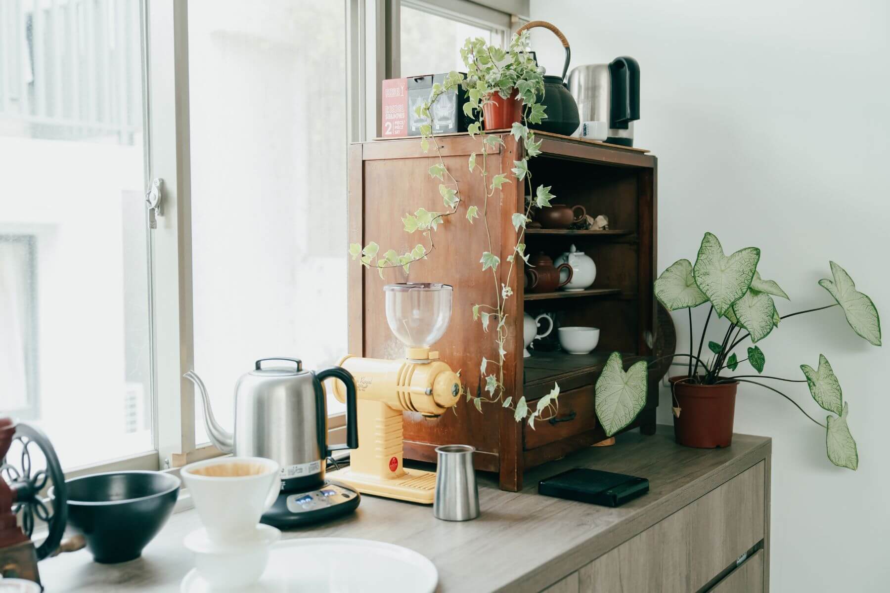 藍大誠的焙茶工作室就位於enPure 瀞的3樓。走入工作室,室內陽台用透明玻璃門隔出的焙茶室中,五台竹編焙籠轟隆運作,一旁層架放滿各種品項茶葉,雙面採光的空間設計讓室內光線整體明亮柔和。