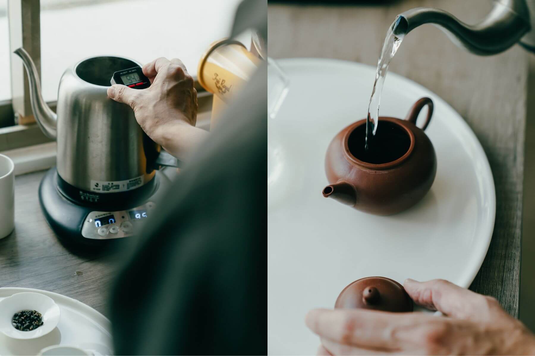 藍大誠每次進工作室的第一件事,就是檢視茶葉焙製的狀況。他用手撈起焙籠裡正在初步乾燥的茶葉,以觸覺與嗅覺感受茶葉的濕度、風味結構等細節,並隨時調整溫度火候。與夥伴確認當天待處理的事務後,他來到工作台前,燒煮開水,拿出勻杯、電子磅秤、溫度計,按下計時器,開始泡茶。