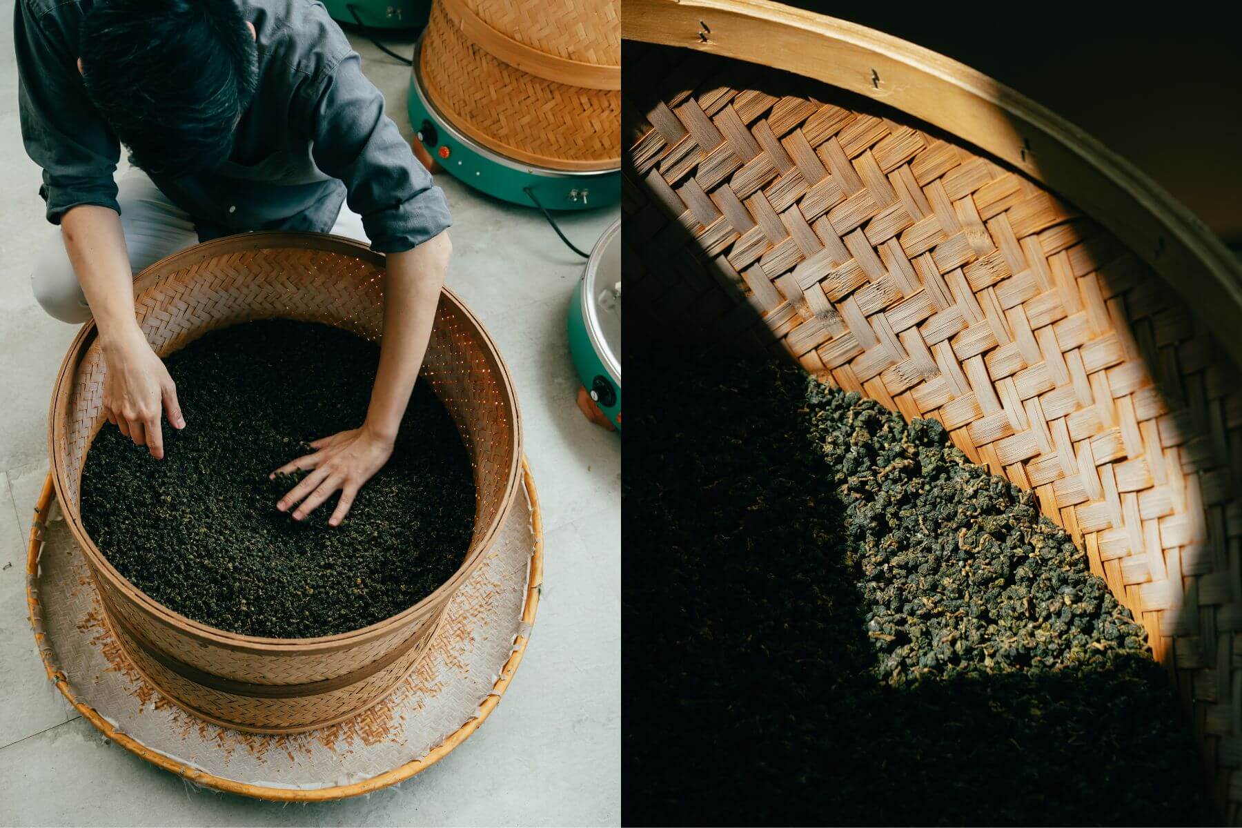 2. (每40至50分鐘)翻茶:每40至50分鐘翻動一次,讓茶葉上下受熱均勻。先進行乾燥工序,去除茶葉的水分後,再進行加溫工序,催化茶葉中的梅納反應。即使現在已有可協助翻茶的機器,藍大誠還是習慣以傳統一籠約5斤的竹編焙籠進行焙茶,並以人力翻茶。