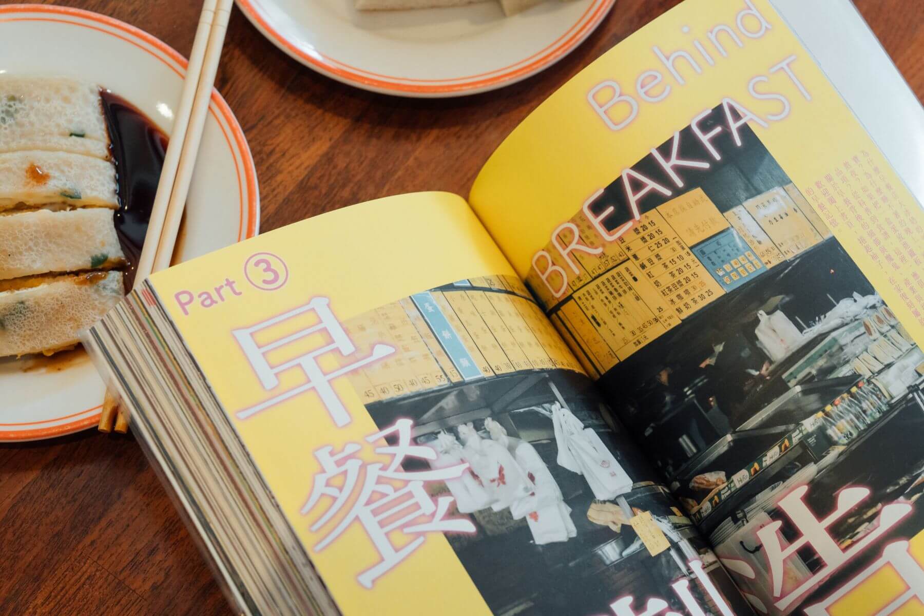 在關於早餐演化史的文章,透過插圖從米粥、番薯籤、豆漿油條,到三明治、漢堡與早午餐拼盤,拼湊出台式早餐的面貌。「台灣早餐是多元且無法被取代的。這展現在我們同時吃三明治、鐵板麵、米粉湯,也喝豆漿、奶茶,不可能用單一早餐來代表台灣的早餐文化。」張文哲說。