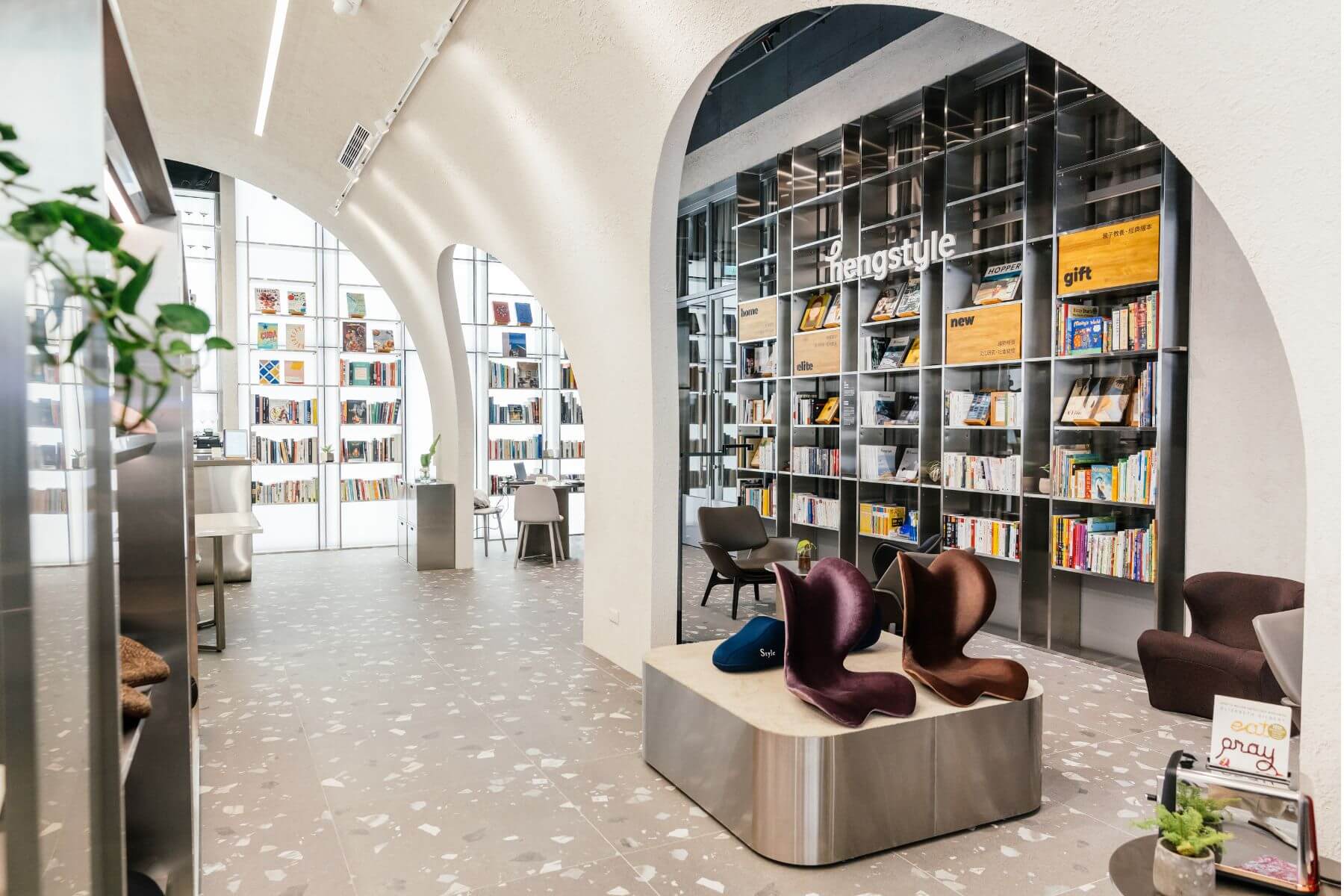 zonezone以冷調的白與不鏽鋼為主元素打造出簡約空間,呈現了充滿氣勢的未來感;形似洞穴的圓拱流線與手砌的牆面肌理則營造了溫潤質地,又為看似冷硬的空間注入居家的溫度與感受;開放式的空間內,除了商品展示,還有書牆、 廚房吧檯以及咖啡座作為多元體驗服務的場域使用,一反過去以商品為主的展售中心模式,恆隆行在全新的概念店提案了一系列以「顧客」 角度出發的創新服務,以「林林總總的生活靈 感」發想店名「zonezone」,希望帶領到訪的人一同探索生活的無限可能。