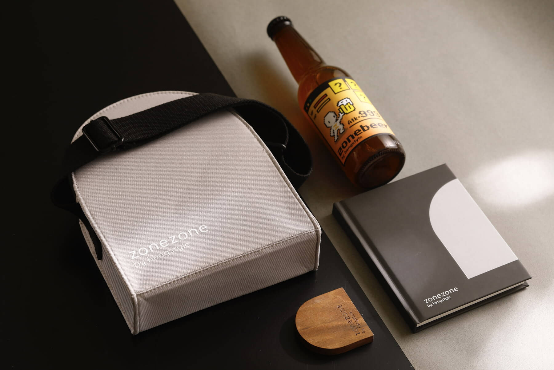 zonezone一周年訂製禮品組合:寶特瓶紗環保材質訂製包、絲絨精裝筆記本、 zoneBEER、胡桃木開瓶器。(圖片/恆隆行)